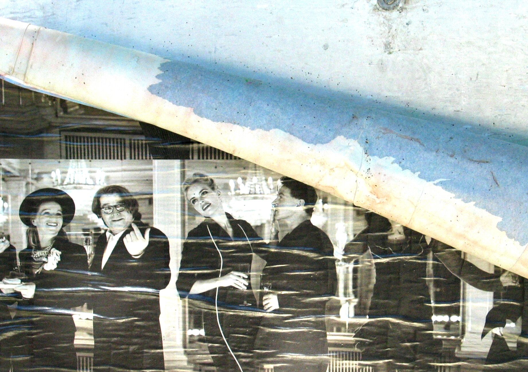 "This photo seems to be an artistic representation that plays with the concepts of fragmentation and continuity in human interactions. It captures moments of social engagement, such as conversation and laughter, but the torn and layered aspect suggests a deeper commentary on the perhaps transient or fragmented nature of these interactions.
