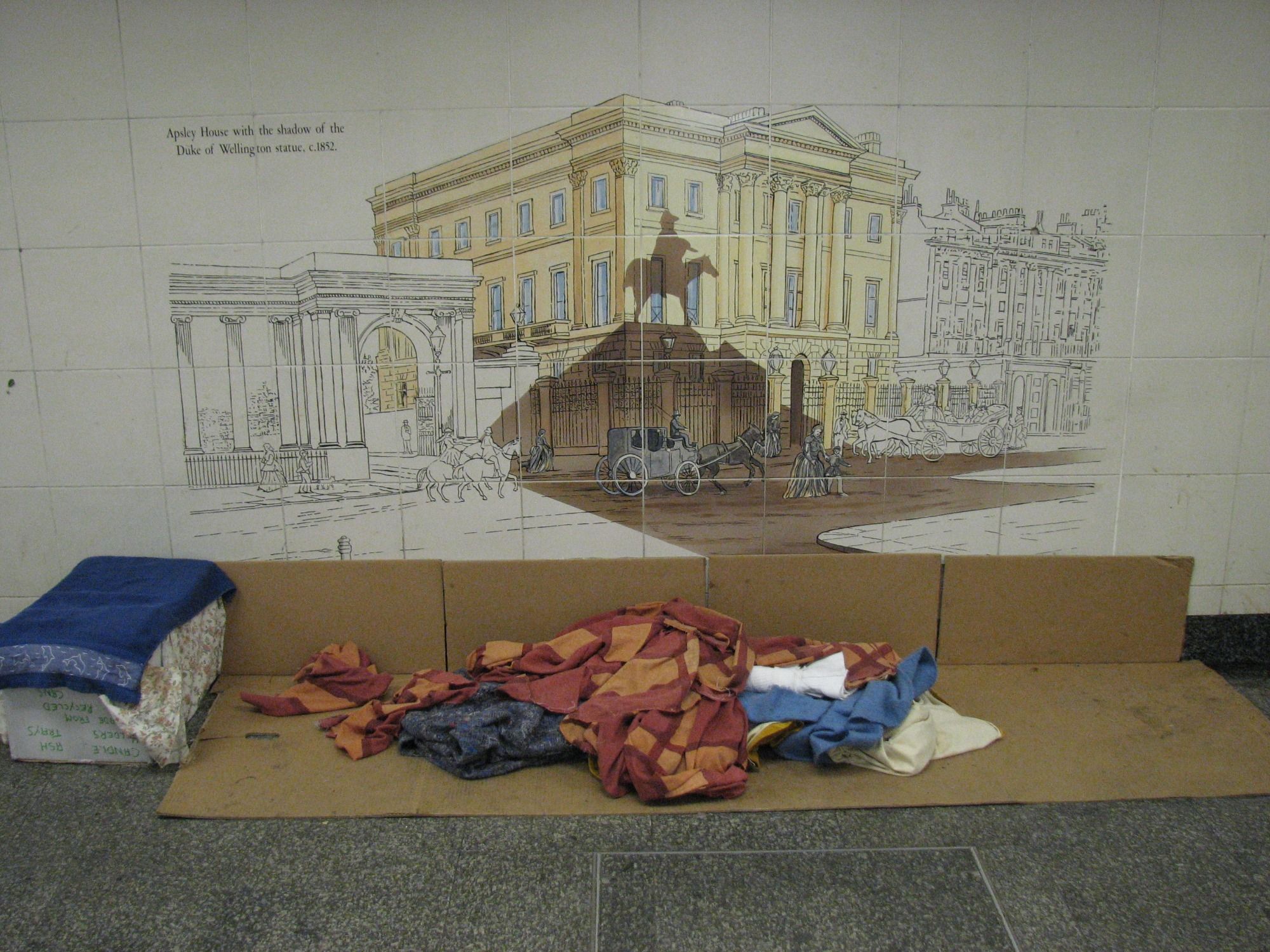 "(...) The second image shows a makeshift bed in an underpass adorned with a drawing of a historical building, possibly Apsley House, with the shadow of the Duke of Wellington statue, circa 1852. This setting contrasts the grandeur of historical wealth and power with the current reality of homelessness. The bed, made from cardboard and a few sparse blankets, starkly contrasts with the regal depiction of the building, highlighting the divide between historical wealth and present-day poverty. (...)"